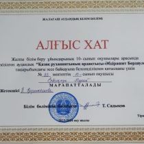 ҚҰТТЫҚТАЙМЫЗ!!! Жалпы білім беретін 10 сынып оқушылары арасында өткізілген аудандық «Қазақ руханиятының ардақтысы- Әбдірашит Бердаулетов» тақырыбындағы эссе байқауында белсенділікпен қатысқаны үшін мектебіміздің оқушысы ЕРБОЛҚЫЗЫ НҰРАЙ «АЛҒЫС ХАТ» иеленді. Жетекшісі:ҚОРҒАНБЕКОВА ЗБАЙРА